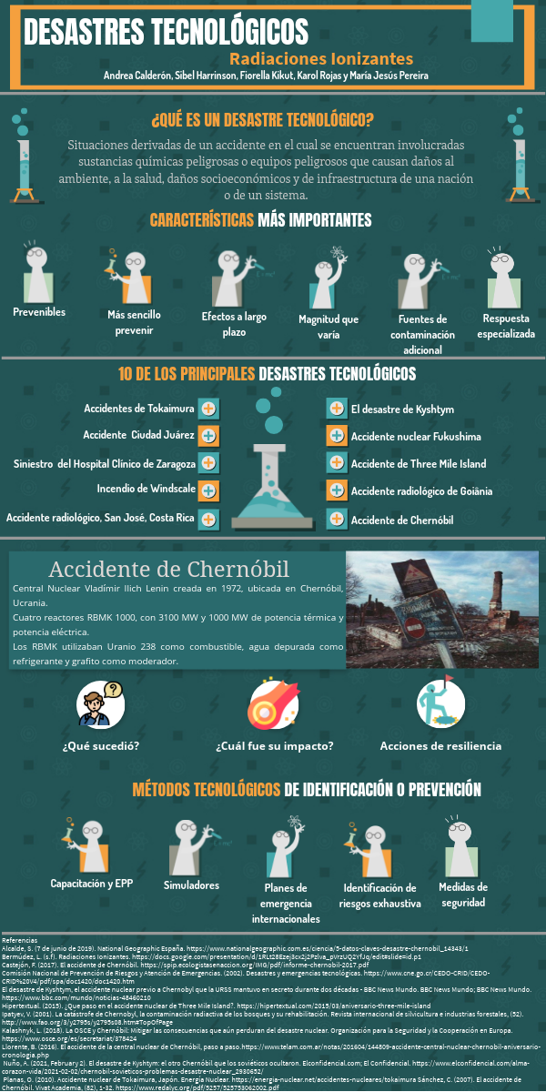 Referencias Alcalde, S. (7 de junio de 2019). National Geographic España. https://www.nationalgeographic.com.es/ciencia/5-datos-claves-desastre-chernobil_14343/1 Bermúdez, L. (s.f). Radiaciones Ionizantes. https://docs.google.com/presentation/d/1RLt28Ezej3cx2j2Pzlva_pVrzUQ2YfJq/edit#slide=id.p1 Castejón, F. (2017). El accidente de Chernóbil. https://spip.ecologistasenaccion.org/IMG/pdf/informe-chernobil-2017.pdf Comisión Nacional de Prevención de Riesgos y Atención de Emergencias. (2002). Desastres y emergencias tecnológicas. https://www.cne.go.cr/CEDO-CRID/CEDO-CRID%20V4/pdf/spa/doc1420/doc1420.htm El desastre de Kyshtym, el accidente nuclear previo a Chernobyl que la URSS mantuvo en secreto durante dos décadas - BBC News Mundo. BBC News Mundo; BBC News Mundo. https://www.bbc.com/mundo/noticias-48460210 Hipertextual. (2015). ¿Que paso en el accidente nuclear de Three Mile Island?. https://hipertextual.com/2015/03/aniversario-three-mile-island Ipatyev, V. (2001). La catástrofe de Chernobyl, la contaminación radiactiva de los bosques y su rehabilitación. Revista internacional de silvicultura e industrias forestales, (52). http://www.fao.org/3/y2795s/y2795s08.htm#TopOfPage Kalashnyk, L. (2018). La OSCE y Chernóbil: Mitigar las consecuencias que aún perduran del desastre nuclear. Organización para la Seguridad y la Cooperación en Europa. https://www.osce.org/es/secretariat/378424 Llorente, B. (2016). El accidente de la central nuclear de Chernóbil, paso a paso.https://www.telam.com.ar/notas/201604/144809-accidente-central-nuclear-chernobil-aniversario-cronologia.php Nuño, A. (2021, February 2). El desastre de Kyshtym: el otro Chernóbil que los soviéticos ocultaron. Elconfidencial.com; El Confidencial. https://www.elconfidencial.com/alma-corazon-vida/2021-02-02/chernobil-sovieticos-problemas-desastre-nuclear_2930652/ Planas, O. (2010). Accidente nuclear de Tokaimura, Japón. Energía Nuclear. https://energia-nuclear.net/accidentes-nucleares/tokaimura Sánchez, C. (2007). El accidente de Chernóbil. Vivat Academia, (82), 1-32. https://www.redalyc.org/pdf/5257/525753062002.pdf