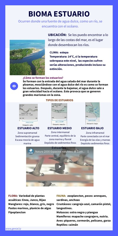 ¿Cómo se forman los estuarios?Se forman con la entrada del agua salada del mar durante la pleamar, mezclándose con el agua dulce del río es como se forman los estuarios. Después, durante la bajamar, el agua dulce sale a gran velocidad hacia el océano. Esto provoca que se generen grandes marismas en la zona.