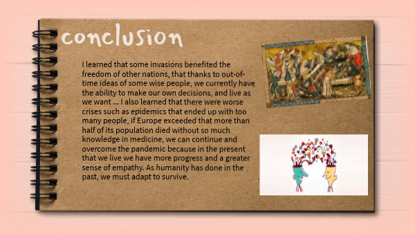 I learned that some invasions benefited the freedom of other nations, that thanks to out-of-time ideas of some wise people, we currently have the ability to make our own decisions, and live as we want ... I also learned that there were worse crises such as epidemics that ended up with too many people, if Europe exceeded that more than half of its population died without so much knowledge in medicine, we can continue and overcome the pandemic because in the present that we live we have more progress and a greater sense of empathy. As humanity has done in the past, we must adapt to survive.