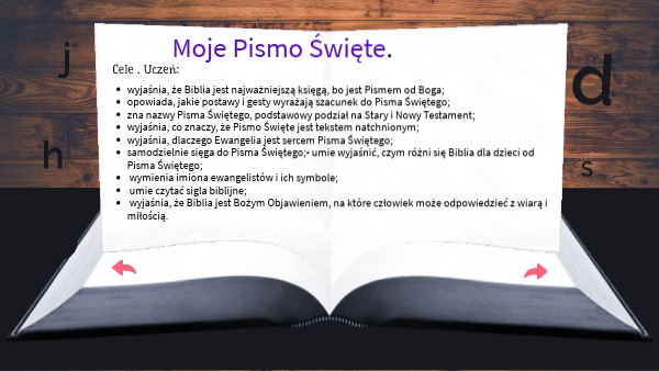 - samodzielnie sięga do Pisma Świętego;• umie wyjaśnić, czym różni się Biblia dla dzieci od Pisma Świętego;
