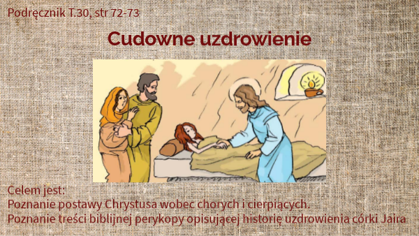 Celem jest: Poznanie postawy Chrystusa wobec chorych i cierpiących. Poznanie treści biblijnej perykopy opisującej historię uzdrowienia córki Jaira