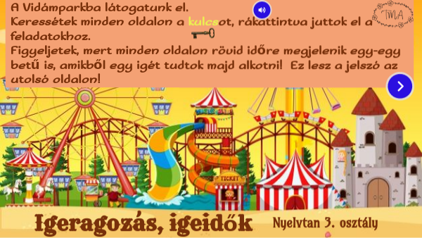A Vidámparkba látogatunk el. Keressétek minden oldalon a kulcsot, rákattintva juttok el a feladatokhoz. Figyeljetek, mert minden oldalon rövid időre megjelenik egy-egy betű is, amikből egy igét tudtok majd alkotni! Ez lesz a jelszó az utolsó oldalon!