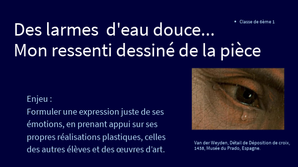 Enjeu : Formuler une expression juste de ses émotions, en prenant appui sur ses propres réalisations plastiques, celles des autres élèves et des œuvres d’art.