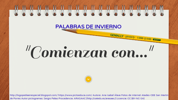 http://logopediaenespecial.blogspot.com/ https://www.pictoeduca.com/ Autora: Ana Isabel Álava Fotos de Internet Atades-CEE San Martín de Porres Autor pictogramas: Sergio Palao Procedencia: ARASAAC (http://catedu.es/arasaac/) Licencia: CC (BY-NC-SA)