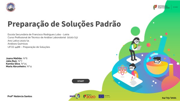 O presente trabalho aborda o tema da preparação de soluções, mais concretamente a preparação de soluções padrão. Com este trabalho temos como objetivo dar-vos a conhecer as características das soluções padrão, os diferentes tipos de procedimento que se podem seguir para a elaboração de uma, os materiais necessários e ainda os cuidados que devem de ter quando a preparam. O trabalho está organizado em 3 partes diferentes, a introdução, onde se aborda a vertente mais teórica, o desenvolvimento, onde mostramos pelo meio de vídeos e imagens o seu procedimento e ainda uma conclusão onde fazemos um breve resumo do falado anteriormente. Para a apresentação presente foram necessárias várias pesquisas, quer em documentos fornecidos pela professora quer noutros encontrados na WEB.