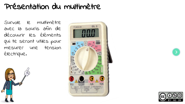 Survole le multimètre avec la souris afin de découvrir les éléments qui te seront utiles pour mesurer une tension électrique.