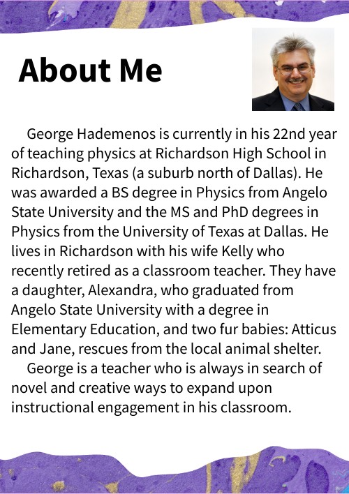 George Hademenos is currently in his 22nd year of teaching physics at Richardson High School in Richardson, Texas (a suburb north of Dallas). He was awarded a BS degree in Physics from Angelo State University and the MS and PhD degrees in Physics from the University of Texas at Dallas. He lives in Richardson with his wife Kelly who recently retired as a classroom teacher. They have a daughter, Alexandra, who graduated from Angelo State University with a degree in Elementary Education, and two fur babies: Atticus and Jane, rescues from the local animal shelter. George is a teacher who is always in search of novel and creative ways to expand upon instructional engagement in his classroom.