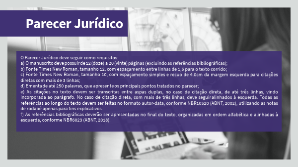 O Parecer Jurídico deve seguir como requisitos: a) O manuscrito deve possuir de 12 (doze) a 20 (vinte) páginas (excluindo as referências bibliográficas); b) Fonte Times New Roman, tamanho 12, com espaçamento entre linhas de 1,5 para o texto corrido; c) Fonte Times New Roman, tamanho 10, com espaçamento simples e recuo de 4.0cm da margem esquerda para citações diretas com mais de 3 linhas; d) Ementa de até 250 palavras, que apresente os principais pontos tratados no parecer; e) As citações no texto devem ser transcritas entre aspas duplas, no caso de citação direta, de até três linhas, vindo incorporada ao parágrafo. No caso de citação direta, com mais de três linhas, deve seguir alinhados à esquerda. Todas as referências ao longo do texto devem ser feitas no formato autor-data, conforme NBR10520 (ABNT, 2002), utilizando as notas de rodapé apenas para fins explicativos. f) As referências bibliográficas deverão ser apresentadas no final do texto, organizadas em ordem alfabética e alinhadas à esquerda, conforme NBR6023 (ABNT, 2018).