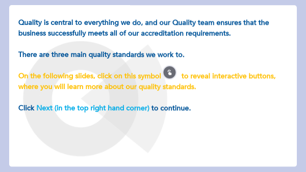 Quality is central to everything we do, and our Quality team ensures that the business successfully meets all of our accreditation requirements. There are three main quality standards we work to. On the following slides, click on this symbol to reveal interactive buttons, where you will learn more about our quality standards. Click Next (in the top right hand corner) to continue.