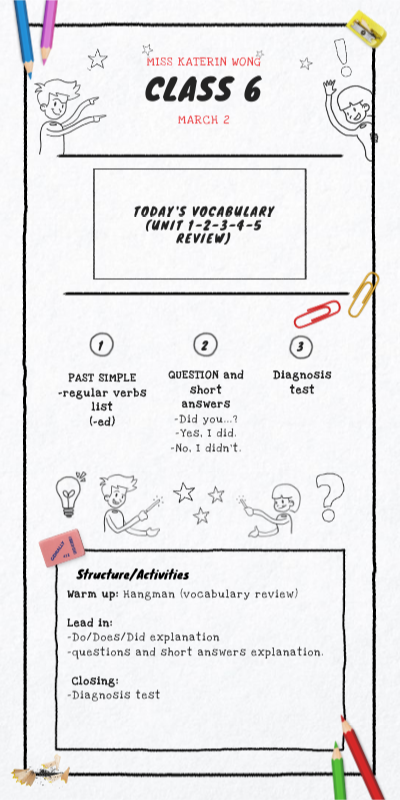 Warm up: Hangman (vocabulary review) Lead in: -Do/Does/Did explanation -questions and short answers explanation. Closing: -Diagnosis test