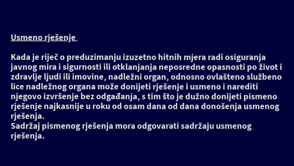 Usmeno rješenje Kada je riječ o preduzimanju izuzetno hitnih mjera radi osiguranja javnog mira i sigurnosti ili otklanjanja neposredne opasnosti po život i zdravlje ljudi ili imovine, nadležni organ, odnosno ovlašteno službeno lice nadležnog organa može donijeti rješenje i usmeno i narediti njegovo izvršenje bez odgađanja, s tim što je dužno donijeti pismeno rješenje najkasnije u roku od osam dana od dana donošenja usmenog rješenja. Sadržaj pismenog rješenja mora odgovarati sadržaju usmenog rješenja.
