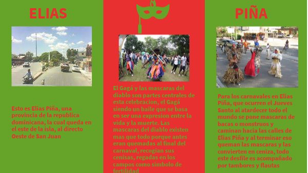 Para los carnavales en Elias Piña, que ocurren el Jueves Santo al atardecer todo el mundo se pone mascaras de bacas o monstruos y caminan hacia las calles de Elias Piña y al terminar eso queman las mascaras y las convierten en ceniza, todo este desfile es acompañado por tambores y flautas