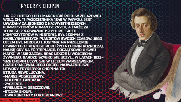 ur. 22 lutego lub 1 marca 1810 roku w Żelazowej Woli, zm. 17 października 1849 w Paryżu. Jest uważany za jednego z najwybitniejszych kompozytorów romantycznych, a także za jednego z najważniejszych polskich kompozytorów w historii. Był jednym z najsłynniejszych pianistów swoich czasów. Jego Ojcem był mikołaj i justyna. Na przełomie czwartego i piątego roku życia Chopin rozpoczął naukę gry na fortepianie, początkowo u swej matki. W 1816 zaczął brać lekcje u Wojciecha Żywnego. Bardzo szybko się uczył.. W latach 1823–1826 Chopin uczył się w Liceum Warszawskim, gdzie pracował jego ojciec. Najważniejsze utwory Fryderyka Chopina to:Etiuda Rewolucyjna.