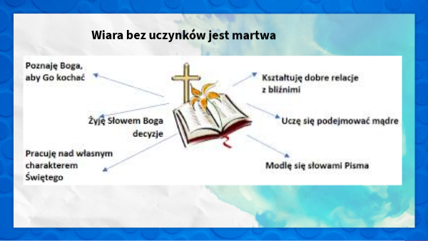 Jeśli w coś wierzysz, ale twoja wiara nie jest poparta żadnymi czynami, to tak naprawdę nie wierzysz - to, parafrazując, mówi nam św. Jakub w swoim liście, w drugim rozdziale, wersy od 14 do 26. Martwa wiara (lub jak mówią niektóre przekłady bezużyteczna), nie poparta żadnymi czynami, nie jest wiarą zapewniającą zbawienie. Wielu chrześcijan w dzisiejszych czasach o tym zapomina.
