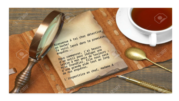 Bienvenue à toi cher détective en herbe! Te voici lancé dans ta première enquête... Pour commencer, j'ai besoin d'un outil pour rédiger une lettre à mon amie de toujours : Miss Standfiel. Elle nous sera d'une grande aide tout au long de nos enquêtes. L'inspectrice en chef, madame A