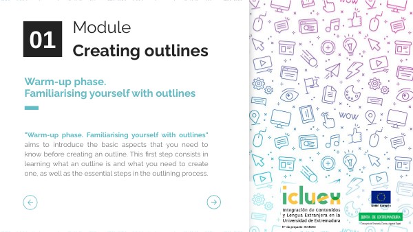 "Warm-up phase. Familiarising yourself with outlines" aims to introduce the basic aspects that you need to know before creating an outline. This first step consists in learning what an outline is and what you need to create one, as well as the essential steps in the outlining process.