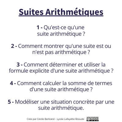 Une suite arithmétique est une suite dont chaque terme est obtenu en additionnant au terme précédent un même nombre (appelé la raison). Une suite arithmétique (un) de raison r est donc définie par son premier terme et par la relation de récurrence un+1 = un + r.
