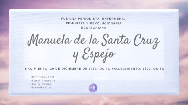 1. Fuente: Wikipedia, www.wikipedia.org, Brainly, Monografías, BuenasTareas, Slideshare, Prezi, Yahoo, https://espanol.answers.yahoo.com/2. López Molina, Hector. Manuela Espejo y Aldaz. Obtenido de enciclopediadequito.blogspot.com 3. Historia y Biografía. Manuela de la Santa Cruz y Espejo. Obtenido de historia-biografia.com 4. Real Academia de la Historia. Manuela Espejo. Obtenido de dbe.rah.es 5. History of Revolutionary Women. Manuela Espejo. Obtenido de ecuadorian-revolutionary-women.webnode.ec 6. Biografía de. Biografía de Manuela Espejo. Obtenido de biografiadee.com APA Montaño, Joaquín. (10 de septiembre de 2020). Manuela Espejo: la primera feminista ecuatoriana. Lifeder. Recuperado de https://www.lifeder.com/manuela-santa-cruz-y-espejo/.