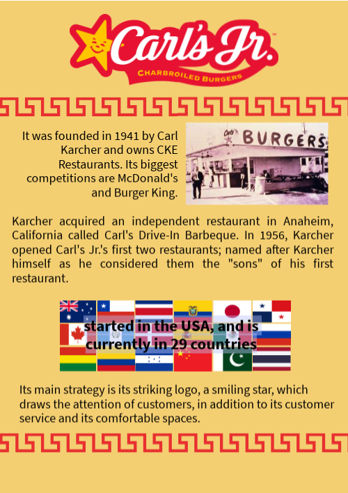 It was founded in 1941 by Carl Karcher and owns CKE Restaurants. Its biggest competitions are McDonald's and Burger King.