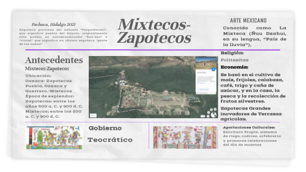 Ubicación:Oaxaca- Zapotecas Puebla, Oaxaca y Guerrero.-Mixtecos Época de esplendor: Zapotecas: entre los años 500 a. C. y 900 d. C. Mixtecos; entre los 200 a. C. y 900 d. C.