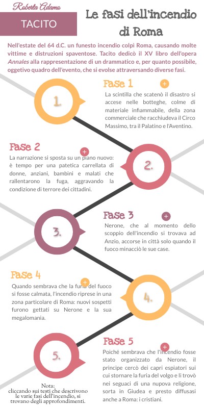 Nell'estate del 64 d.C. un funesto incendio colpì Roma, causando molte vittime e distruzioni spaventose. Tacito dedicò il XV libro dell'opera Annales alla rappresentazione di un drammatico e, per quanto possibile, oggetivo quadro dell'evento, che si evolse attraversando diverse fasi.