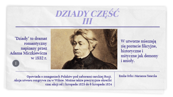 Książka "Dziady cz. III" (wydawnictwa Greg)Książka "Repetytorium maturzysty - język polski (wydawnictwa Greg)" Słownik internetowy sjp.pwn Wikipedia https://klp.pl/romantyzm/a-9927.html Akcent od Marianny - obraz mody damskiej w czasach akcji utworu - tutaj najprawdopodobniej suknia balowa :) --------->