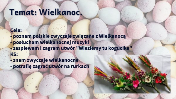 Cele: - poznam polskie zwyczaje związane z Wielkanocą - posłucham wielkanocnej muzyki - zaspiewam i zagram utwór "Wieziemy tu kogucika" KS: - znam zwyczaje wielkanocne - potrafię zagrać utwór na rurkach
