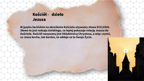 W języku łacińskim na określenie Kościoła używamy słowa ECCLESIA. Słowo to jest rodzaju żeńskiego, co lepiej pokazuje relację Jezusa do Kościoła. Kościół nazywany jest Oblubienicą Chrystusa, a więc czymś, co Jezus kocha, tak bardzo, że oddaje za to Swoje Życie.