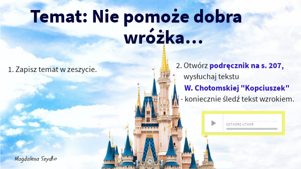 2. Otwórz podręcznik na s. 207, wysłuchaj tekstu W. Chotomskiej "Kopciuszek" - koniecznie śledź tekst wzrokiem.