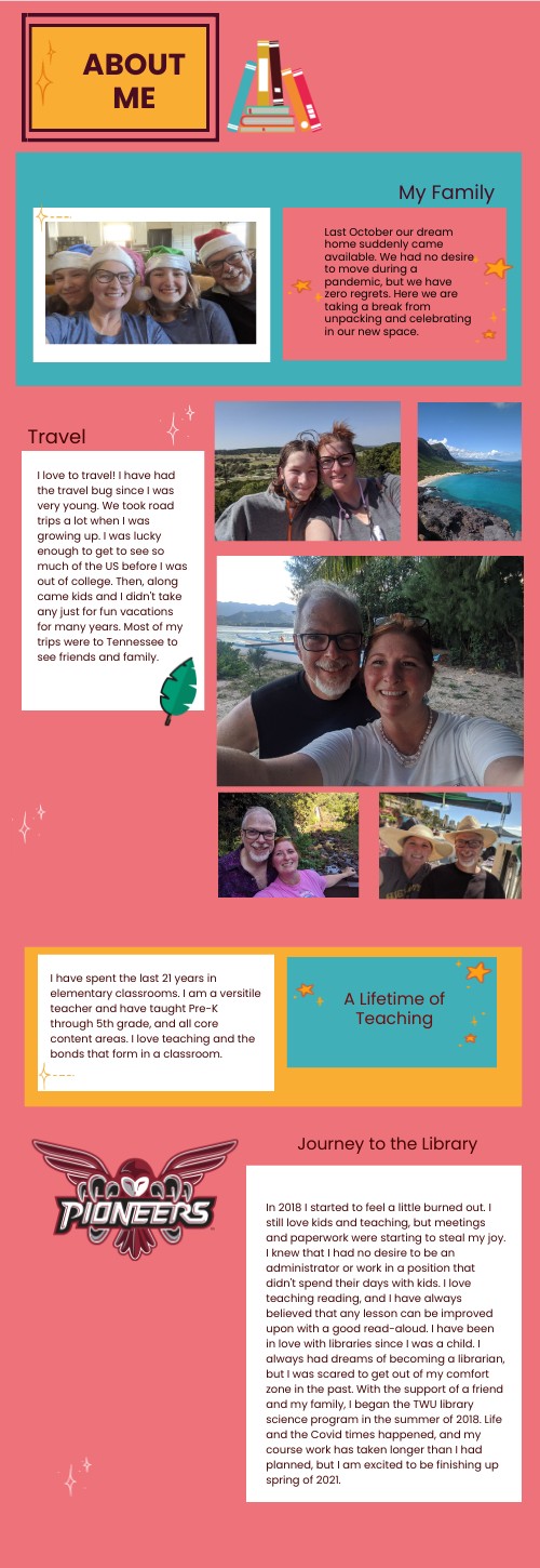 In 2018 I started to feel a little burned out. I still love kids and teaching, but meetings and paperwork were starting to steal my joy. I knew that I had no desire to be an administrator or work in a position that didn't spend their days with kids. I love teaching reading, and I have always believed that any lesson can be improved upon with a good read-aloud. I have been in love with libraries since I was a child. I always had dreams of becoming a librarian, but I was scared to get out of my comfort zone in the past. With the support of a friend and my family, I began the TWU library science program in the summer of 2018. Life and the Covid times happened, and my course work has taken longer than I had planned, but I am excited to be finishing up spring of 2021.
