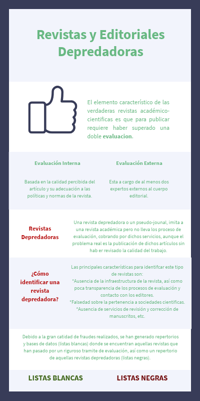 Las principales características para identifcar este tipo de revistas son:*Ausencia de la infraestructura de la revista, así como poca transparencia de los procesos de evaluación y contacto con los editores. *Falsedad sobre la pertenencia a sociedades cientificas. *Ausencia de servicios de revisión y corrección de manuscritos, etc.