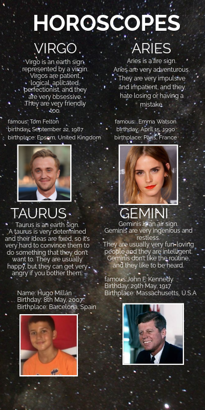 Taurus is an earth sign. A taurus is very determined and their ideas are fixed, so it’s very hard to convince them to do something that they don’t want to. They are usually happy, but they can get very angry if you bother them.