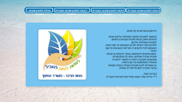 רכזים/ות ומורים/ים יקרים/ות, בהמשך לתוכנית המיקוד שנשלחה אליכם אנחנו מזמינות אתכן לבנות תוכנית שבועית בהתאם לתוכנית שנשלחה אליכם. לפניכם כמה דגמים לארגון השבועות עד סוף השנה. המשותף לכל הדגמים זו הפריסה השבועית עד סוף השנה. אתם מוזמנים להשתמש באחד הדגמים או לבנות תוכנית עבודה משלכם. שימו לב שהקישורים מותאמים לסביבת הלמידה ולחומרי הלמידה שהמורה משתמשת בה עם כיתתה. יש אפשרות להכין תוכנית בטבלה שאינה מקוונת ובלבד שתהיה לכם פריסה רב שנתית. בברכה חמה, ד"ר עליזה עמיר וצוות המדריכות להוראת העברית