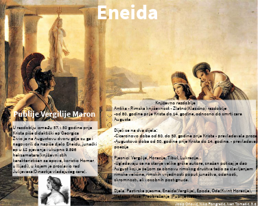 Književno razdoblje Antika - Rimska književnost - Zlatno(Klasično) razdoblje -od 80. godine prije Krista do 14. godine, odnosno do smrti cara Augusta Dijeli se na dva dijela: -Ciceronovo doba od 80. do 30. godine prije Krista - prevladavala proza -Augustovo doba od 30. godine prije Krista do 14. godine. - prevladava poezija Pjesnici: Vergilije, Horacije, Tibul, Lukrecije... -Ugledavaju se na starije velike grčke autore, snažan poticaj je dao August koji je željom za obnovu rimskog društva težio za slavljenjem rimske veličine, rimskih vrijednosti poput junaštva, odanosti, skromnosti, ali i osobnih postignuća. Djela: Pastirske pjesme, Eneida(Vergilije), Epoda, Oda(Kvint Horacije), Metamorfoze/Preobraženje (Publije Nazon).
