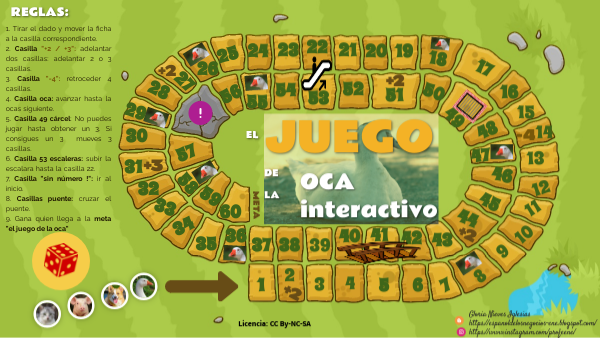 1. Tirar el dado y mover la ficha a la casilla correspondiente.2. Casilla "+2 / +3": adelantar dos casillas: adelantar 2 o 3 casillas. 3. Casilla "-4": retroceder 4 casillas. 4. Casilla oca: avanzar hasta la ocas siguiente. 5. Casilla 49 cárcel: No puedes jugar hasta obtener un 3. Si consigues un 3 mueves 3 casillas. 6. Casilla 53 escaleras: subir la escalara hasta la casilla 22. 7, Casilla "sin número !": ir al inicio. 8. Casillas puente: cruzar el puente. 9. Gana quien llega a la meta "el juego de la oca"