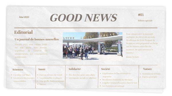 Pour rompre avec la morosité ambiante, les élèves de seconde Henderson du lycée Pergaud de Besançon vous proposent un focus sur les bonnes nouvelles du moment. De quoi retrouver le sourire ! Bonne lecture
