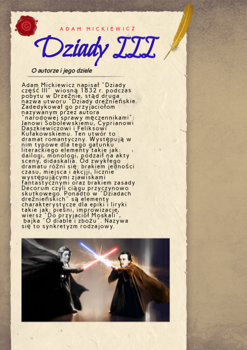 Adam Mickiewicz napisał "Dziady część III" wiosną 1832 r. podczas pobytu w Drzeźnie, stąd druga nazwa utworu "Dziady dreźnieńskie. Zadedykował go przyjaciołom nazywanym przez autora "narodowej sprawy męczennikami": Janowi Sobolewskiemu, Cyprianowi Daszkiewiczowi i Feliksowi Kułakowskiemu. Ten utwór to dramat romantyczny. Występują w nim typowe dla tego gatunku literackiego elementy takie jak: dailogi, monologi, podzaił na akty sceny, didaskalia. Od zwykłego dramatu różni się: brakiem jedności czasu, miejsca i akcjji, licznie występującymi zjawiskami fantastycznymi oraz brakiem zasady Decorum czyli ciągu przyczynowo skutkowego. Ponadto w "Dziadach dreźnieńskich" są elementy charakterystycze dla epiki i liryki takie jak: pieśni, improwizacje, wiersz "Do przyjaciół Moskali", bajka "O diable i zbożu". Nazywa się to synkretyzm rodzajowy.