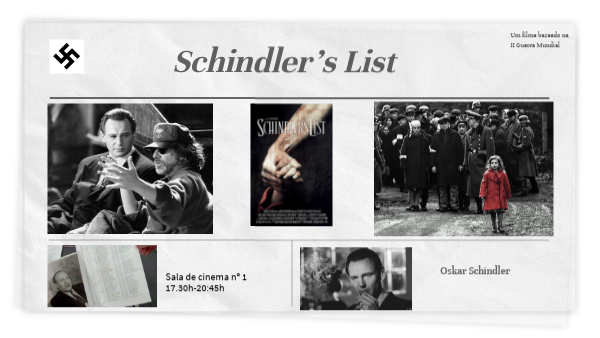 O filme "A Lista de Schindler" é um filme de drama histórico norte-americano; Estriou a 4 de março de 1994. Tem como elenco principal: Liam Neeson, Ben Kingsley, Ralph Fiennes, Embeth Davidtz, Caroline Goodall, Jonathan Sagall, Mark Ivanir, Malgorzata Gebel, Beatrice Macola, Branko Lustig, Andrzej Seweryn, Norbert Weisser etc. Ganhou 34 prêmios entre eles o Oscar do melhor filme, Prêmio BAFTA de cinema: melhor fime, Oscar da melhor fotofragia etc.