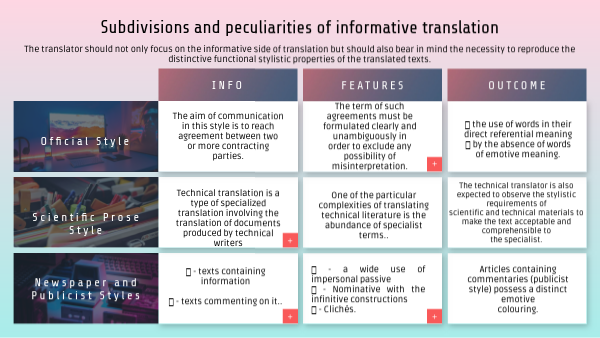 The translator should not only focus on the informative side of translation but should also bear in mind the necessity to reproduce the distinctive functional stylistic properties of the translated texts.