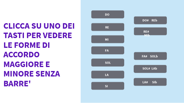 CLICCA SU UNO DEI TASTI PER VEDERE LE FORME DI ACCORDO MAGGIORE E MINORE SENZA BARRE'