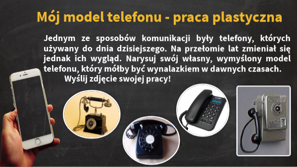 Jednym ze sposobów komunikacji były telefony, których używany do dnia dzisiejszego. Na przełomie lat zmieniał się jednak ich wygląd. Narysuj swój własny, wymyślony model telefonu, który mółby być wynalazkiem w dawnych czasach. Wyślij zdjęcie swojej pracy!