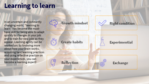 In an uncertain and constantly changing world, "learning to learn" has become the must-have skill for being able to adapt quickly to changes in your job and to train for new jobs as they appear. Learning agility can be worked on: by knowing more about how your brain works, acquiring best learning practices and using reflective practice on your experiences, you can become a learning expert!