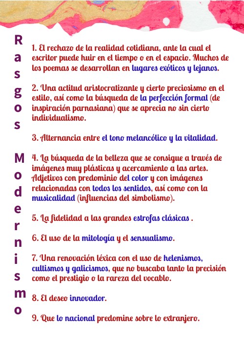 1. El rechazo de la realidad cotidiana, ante la cual el escritor puede huir en el tiempo o en el espacio. Muchos de los poemas se desarrollan en lugares exóticos y lejanos. 2. Una actitud aristocratizante y cierto preciosismo en el estilo, así como la búsqueda de la perfección formal (de inspiración parnasiana) que se aprecia no sin cierto individualismo. 3. Alternancia entre el tono melancólico y la vitalidad. 4. La búsqueda de la belleza que se consigue a través de imágenes muy plásticas y acercamiento a las artes. Adjetivos con predominio del color y con imágenes relacionadas con todos los sentidos, así como con la musicalidad (influencias del simbolismo). 5. La fidelidad a las grandes estrofas clásicas . 6. El uso de la mitología y el sensualismo. 7. Una renovación léxica con el uso de helenismos, cultismos y galicismos, que no buscaba tanto la precisión como el prestigio o la rareza del vocablo. 8. El deseo innovador. 9. Que lo nacional predomine sobre lo extranjero.