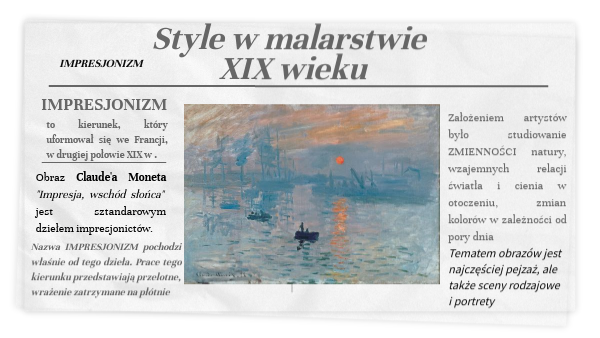 Nazwa IMPRESJONIZM pochodzi właśnie od tego dzieła. Prace tego kierunku przedstawiają przelotne, wrażenie zatrzymane na płótnie
