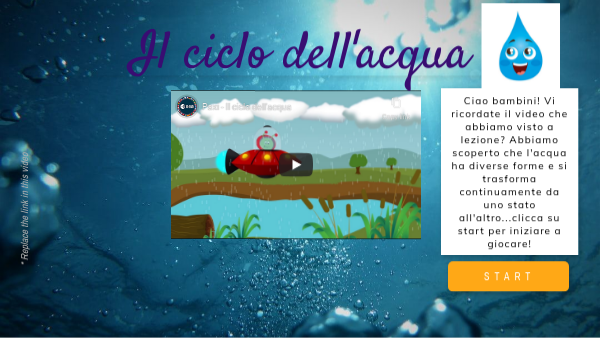 Ciao bambini! Vi ricordate il video che abbiamo visto a lezione? Abbiamo scoperto che l'acqua ha diverse forme e si trasforma continuamente da uno stato all'altro...clicca su start per iniziare a giocare!