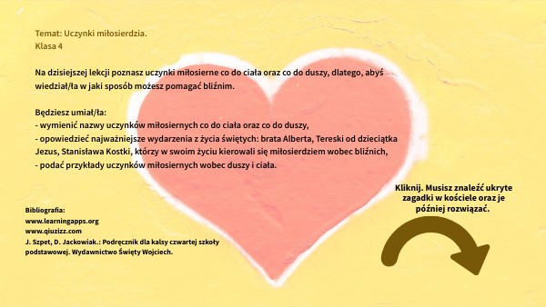 Temat: Uczynki miłosierdzia. Klasa 4 Na dzisiejszej lekcji poznasz uczynki miłosierne co do ciała oraz co do duszy, dlatego, abyś wiedział/ła w jaki sposób możesz pomagać bliźnim. Będziesz umiał/ła: - wymienić nazwy uczynków miłosiernych co do ciała oraz co do duszy, - opowiedzieć najważniejsze wydarzenia z życia świętych: brata Alberta, Tereski od dzieciątka Jezus, Stanisława Kostki, którzy w swoim życiu kierowali się miłosierdziem wobec bliźnich, - podać przykłady uczynków miłosiernych wobec duszy i ciała.
