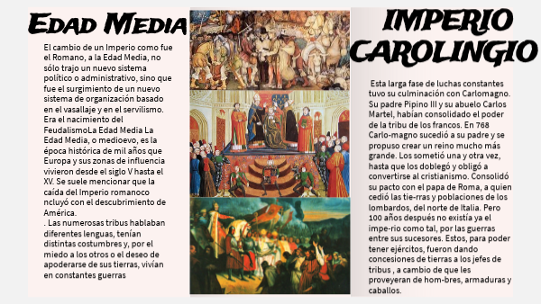 Esta larga fase de luchas constantes tuvo su culminación con Carlomagno. Su padre Pipino III y su abuelo Carlos Martel, habían consolidado el poder de la tribu de los francos. En 768 Carlo-magno sucedió a su padre y se propuso crear un reino mucho más grande. Los sometió una y otra vez, hasta que los doblegó y obligó a convertirse al cristianismo. Consolidó su pacto con el papa de Roma, a quien cedió las tie-rras y poblaciones de los lombardos, del norte de Italia. Pero 100 años después no existía ya el impe-rio como tal, por las guerras entre sus sucesores. Estos, para poder tener ejércitos, fueron dando concesiones de tierras a los jefes de tribus , a cambio de que les proveyeran de hom-bres, armaduras y caballos.