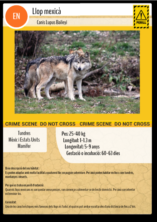 Breu descripció del seu hàbitat :Es poden adaptar amb molta facilitat a qualsevol lloc on puguin sobreviure. Per això poden habitar en llocs com tundres, muntanyes i deserts. Per què es troba en perill d'extinció: Quan els llops mexicans es van quedar sense presses, van començar a alimentar-se de bestir domèstic. Per això van intentar exterminar-los. Curiositat: Una de les característiques més famoses dels llops és l'udol, el qual es pot arribar escoltar des d'una distància de fins a 2 km.