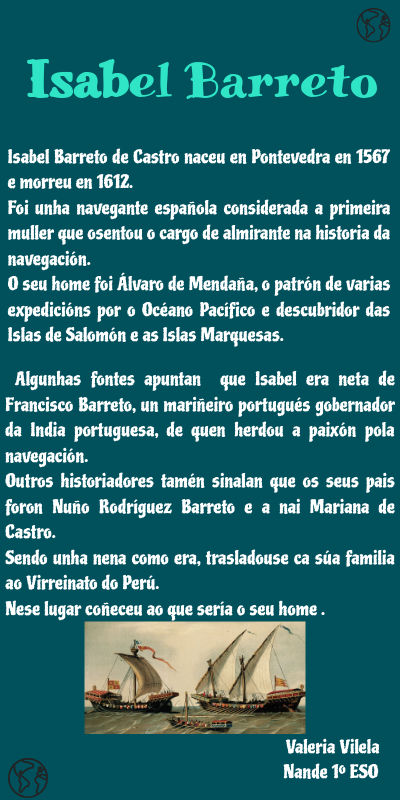 Isabel Barreto de Castro naceu en Pontevedra en 1567 e morreu en 1612. Foi unha navegante española considerada a primeira muller que osentou o cargo de almirante na historia da navegación. O seu home foi Álvaro de Mendaña, o patrón de varias expedicións por o Océano Pacífico e descubridor das Islas de Salomón e as Islas Marquesas.