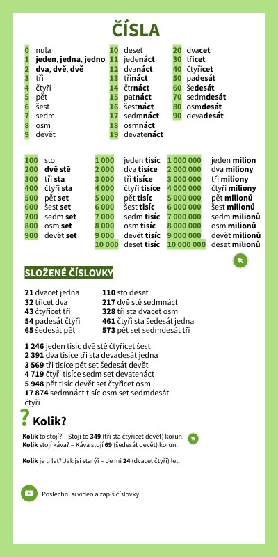 Kolik to stojí? – Stojí to 349 (tři sta čtyřicet devět) korun. Kolik stojí káva? – Káva stojí 69 (šedesát devět) korun. Kolik je ti let? Jak jsi starý? – Je mi 24 (dvacet čtyři) let.